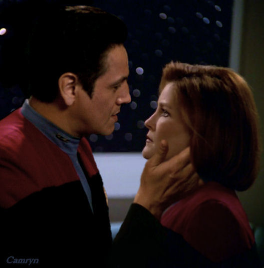 Chakotay extended his open hand towards her and she reluctantly placed hers on top of it. He pulled her close, placed one hand on her lower back, and laid the other on the side of her neck, his thumb gently caressing her cheek.